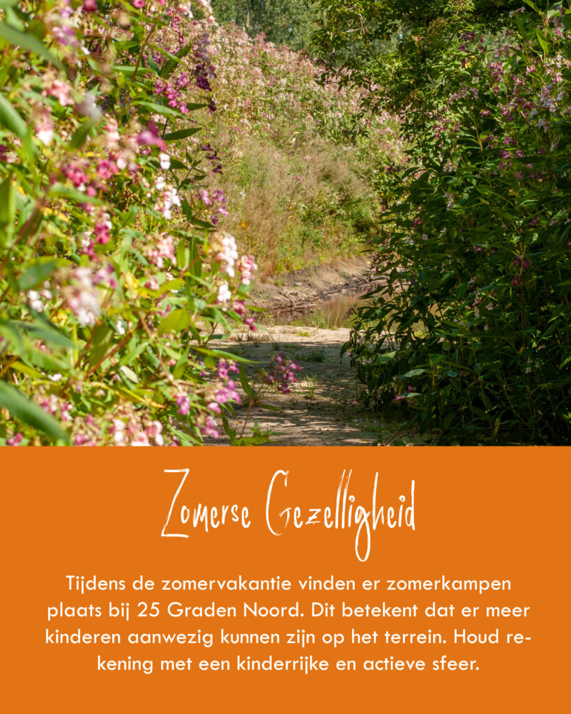 Hier is geen ruimte voor versterkte muziek en grote feesten; in plaats daarvan koesteren we de geluiden van gitaarmuziek bij het kampvuur, het gefluit van vogels en het ritselen van bladeren. Een plek waar kinderen op blote voeten kunnen rennen, kikkers vangen in de sloot, en waar je samen kunt genieten van de eenvoudige geneugten van het buitenleven. Met 4 hectare aan autovrij terrein ben je hier één met de natuur. Begin je dag met een verfrissende ochtendduik, laat je betoveren door de sterrenhemel en laat de maan je nachtlampje zijn.